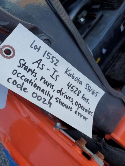 Kubota SSV65 Skid Steer 'Runs & Operates' - 4,528 Hours on Meter, Orops, Side Glass, Auxiliary Hydraulics, Power Latch, 2 Speed, Occasionally Through Code SN# PlateMissing / Onsite Lot# 1552 -- Item Located @ the Cumberland Valley Auction Yard - 101 Springfield Rd Shippensburg PA 17257