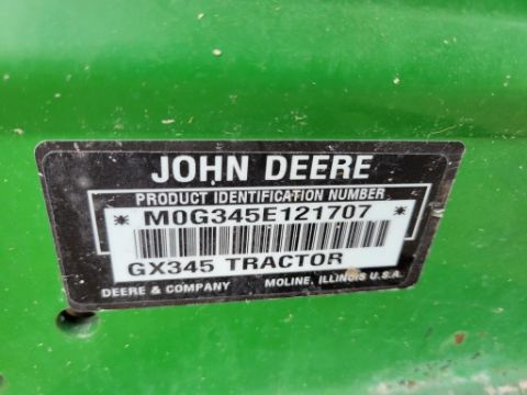 { Choice of lots: 6532 } John Deere GX345 Riding Tractor 'Ride & Drive' - 1,159 Hours on Meter, 54" Deck, Power Steering, Differential Lock, Power Lift Deck, Hydro, Liquid Cooled Kawasaki Gas, SN# M0G345E121707 / TAG# 3349 --- Item Located @ Weavers Compact Tractor 22 Fish Hatchery Rd, Shippensburg PA 17257