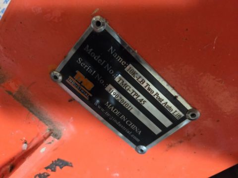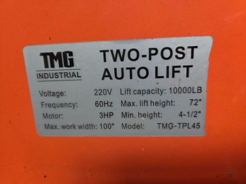 TMG TPL45 Car Lift - 2 Post, Bolt Down, 10K LB Lift, SN# 3190201011 / TAG# 3969 -- Item Located @ 339 Pick Rd. Millmont, PA. For questions about this unit, please call Earl @ 57O.217.1221