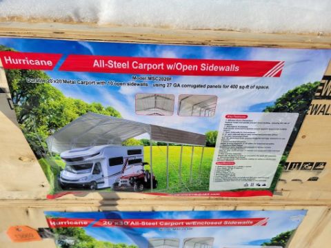 Hurricane MSC2020F Carport 'NEW' - 20x20, 10ft Open Side Walls, NO LOADING OF THIS ITEM BEFORE MONDAY 2/16/2026 ( FILE PHOTOS MAY HAVE BEEN USED FOR THIS UNIT, COLOR And Condition may not be exact due to the quality of workmanship on this unit, YOU MIGHT NOT RECEIVE THE SERIAL NUMBER LISTED IN THE PICTURES RELY On the description for serial numbers, YOU ARE BUYING THIS UNIT AS-IS, MARTIN'S AUCTION SERVICE DOES NOT GUARANTEE ANY FUNCTIONALITY OF THIS UNIT / TAG# 13672 -- Item Located @ the Churchtown Farms Auction Yard - 967 East Earl Rd, New Holland PA 17557