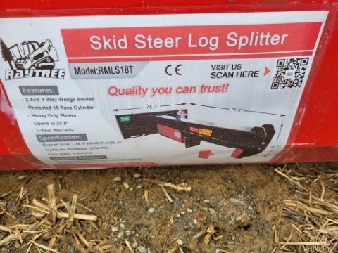 Raytree RMLS18T Log Splitter 'NEW' - Universal Quick Attach, Hydraulic Drive, 4 Way wedge, ( FILE PHOTOS MAY HAVE BEEN USED FOR THIS UNIT, COLOR And Condition may not be exact due to the quality of workmanship on this unit, YOU ARE BUYING THIS UNIT AS-IS, MARTIN'S AUCTION SERVICE DOES NOT GUARANTEE ANY FUNCTIONALITY OF THIS UNIT / TAG# 15260 -- Item Located @ the Cumberland Valley Auction Yard - 101 Springfield Rd Shippensburg PA 17257
